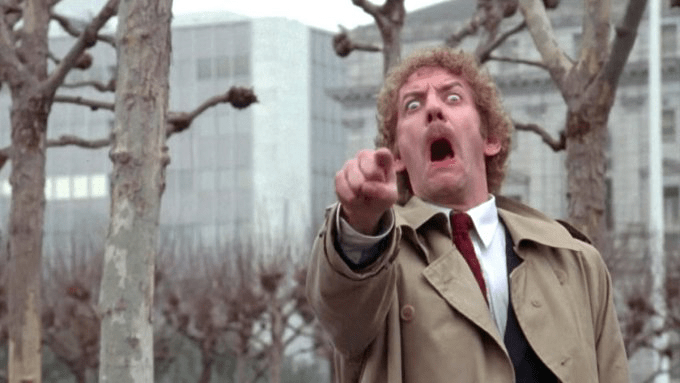 Of course, Invasion of the Body Snatchers is well known for its shocker of an ending: Veronica Cartwright’s character crosses paths with Sutherland’s Bennell and confides in him that she is still indeed human, only to discover that he has ultimately succumbed to the pod people. He then points at her while delivering that infamous pod shriek.