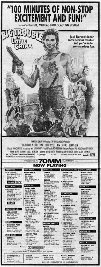 Marking the fourth collaboration of Carpenter and Russell after THE THING, ESCAPE FROM NEW YORK and the TV-movie ELVIS, BIG TROUBLE IN LITTLE CHINA remains the definition of a cult film. Despite that strong pedigree of talent and exceptionally high audience preview numbers, the film failed to catch fire when it opened for the Fourth of July weekend in 1986. It quickly fizzled, mustering a paltry $11 million grand total at the domestic box office on a substantial budget of approximately $20 million. After his badass turns as Snake Plissken in ESCAPE and R.J. MacReady in THING, no one expected Russell to play against type. BIG TROUBLE was competing in the age of RAMBO-style heroes against such summer films as ALIENS, TOP GUN and COBRA, and those were the kind of heroics audiences were anticipating.