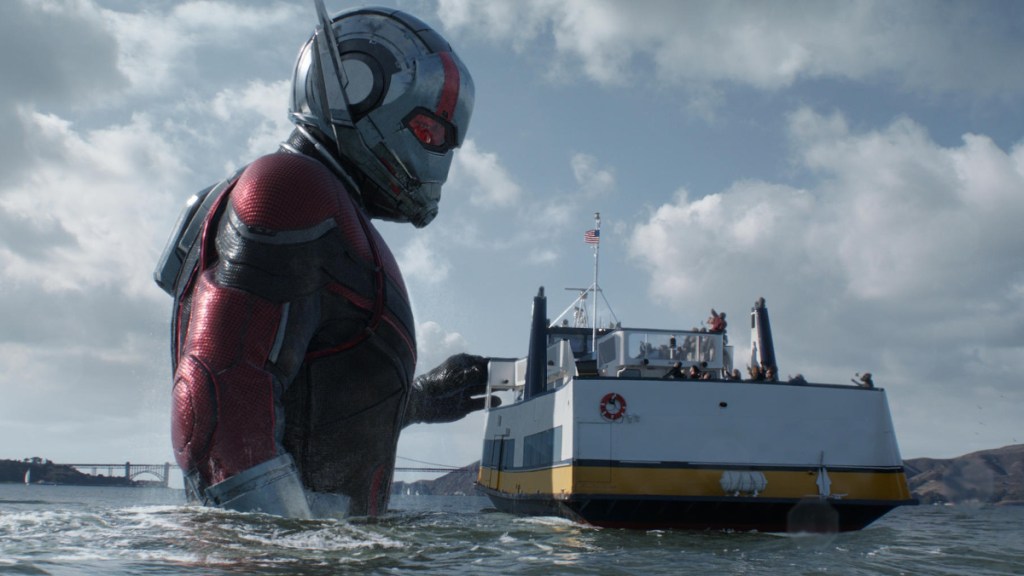 Going for broke with lots of nifty riffs on sight gags of extreme sizes, massive and minuscule, the film makes clever use of cars shrinking to Hot Wheels proportions in unpredictable chases on the hilly streets of San Francisco; everyday objects, like a salt shaker and a Hello Kitty Pez dispenser, growing to become formidable obstacles; and Hank’s lab scaling down to the size of a carry-on bag, serving as a neat back-and-forth McGuffin as friends and foes grapple to get their hands on his next-level technology. Like last time, actual ants have amusingly literal and figurative larger-than-life roles in the story, and Lang gets to be both ant-sized and giant-sized on demand when the moment requires it, this time with a fun-but-inconvenient caveat: His new suit begins to malfunction, so he struggles with a number of unexpected sizes, resulting in one particular laugh-out-loud sequence that finds him stuck in pint-sized mode and forced to wear an oversized hoodie as he sneaks into his daughter’s school to retrieve his backup suit.