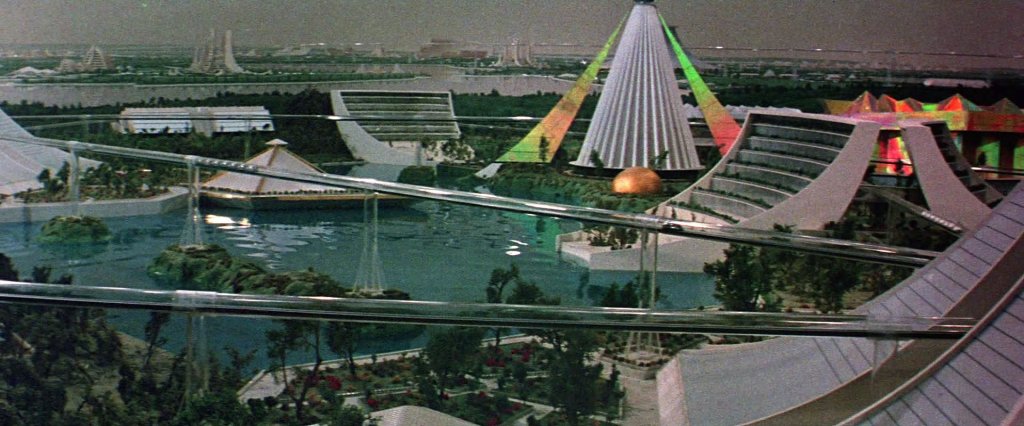 The film, directed by Michael Anderson (whose credits included 1984 and AROUND THE WORLD IN 80 DAYS), is notable for its otherworldly production design, iconic Sandman costumes and weapons, incredibly detailed miniature work creating the illusion of a sprawling, multi-domed-society, and a synthesizer-heavy score by Jerry Goldsmith that contributes to the futuristic feel.