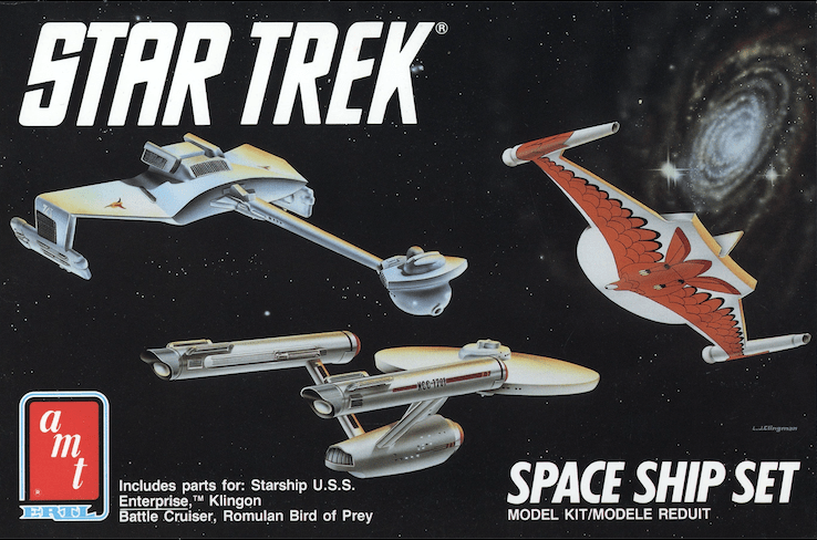 In my childhood bedroom during the ’70s, I had several STAR TREK AMT models dangling by a thread — literally. The U.S.S. Enterprise, with the Galileo shuttlecraft next to it, was by the bedroom window. A Klingon Battle Cruiser was making its way to confront it, while a Romulan Bird of Prey (with a particularly tricky decal that would wrinkle and rip) de-cloaked under my central light fixture.