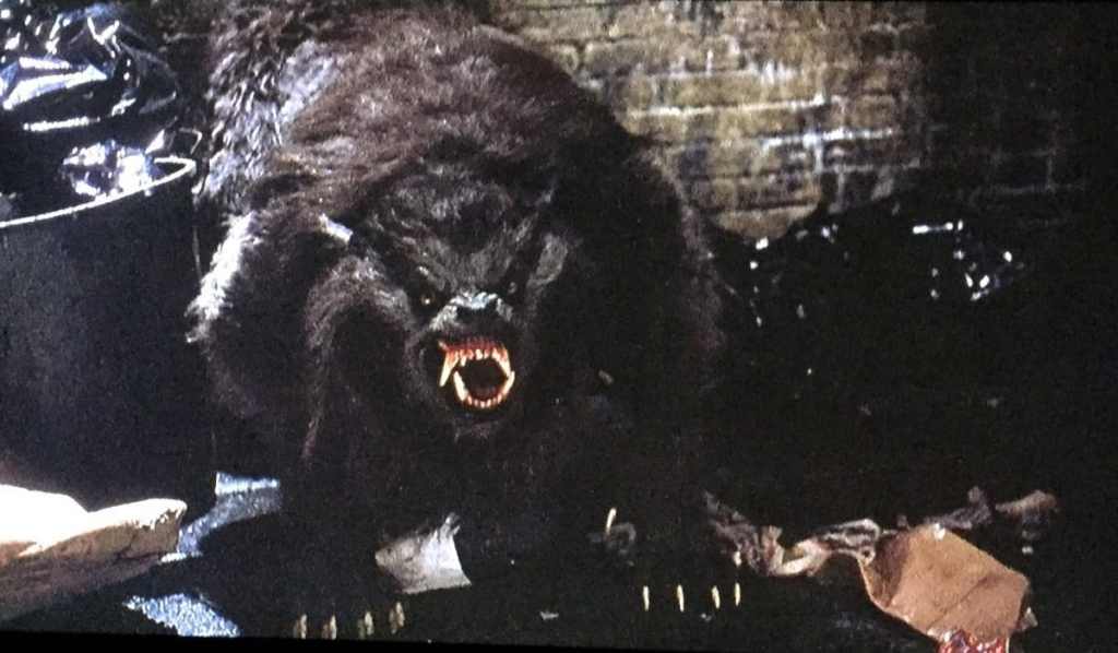 For the final look of the werewolf, Landis had always envisioned a quadruped, declaring, “I want it to be a four-legged hound from hell. Make it!” So Baker sculpted his ultimate werewolf and actually used one of his dogs, Bosco, as inspiration: “He was interesting-looking; the type of dog that has a big mane of hair around its neck, as the werewolf does. Bosco wasn’t as ferocious-looking as the werewolf, but he definitely influenced the design.” Baker also agonized for a time over just how he was going to pull off the movements of a quadruped werewolf: “That was like a problem for a while, and one sleepless night, I just kind of remembered as a kid doing these wheelbarrow race things where somebody holds your feet and you’re walking on your hands. And I thought, yeah, we can kind of use something like that if we actually lay a guy on a board that supports his weight, and his feet are just sticking out the ass of the wolf. Since John said he’s never gonna see it that much, we’ll just frame that part out.”