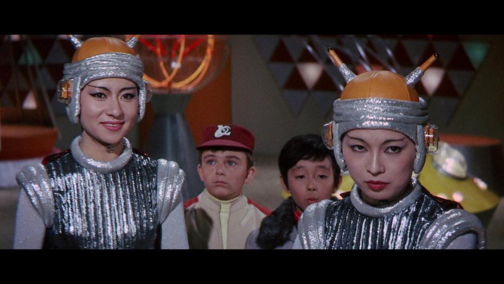 The staples of every Gamera film are perfect for spot-on riffing, including the god-awful English dubbing, the plucky kid(s) who befriend Gamera (Gamera loves kids!), the rubber-suited enemy opponent with a strangely shaped body (a “Mack the Knife” joke was inevitable for the blade-headed Guiron), the strange, malevolent cosmic alien women (with befuddling Southern accents, no less) — and Sandy Frank’s moniker caught in the crossfire.