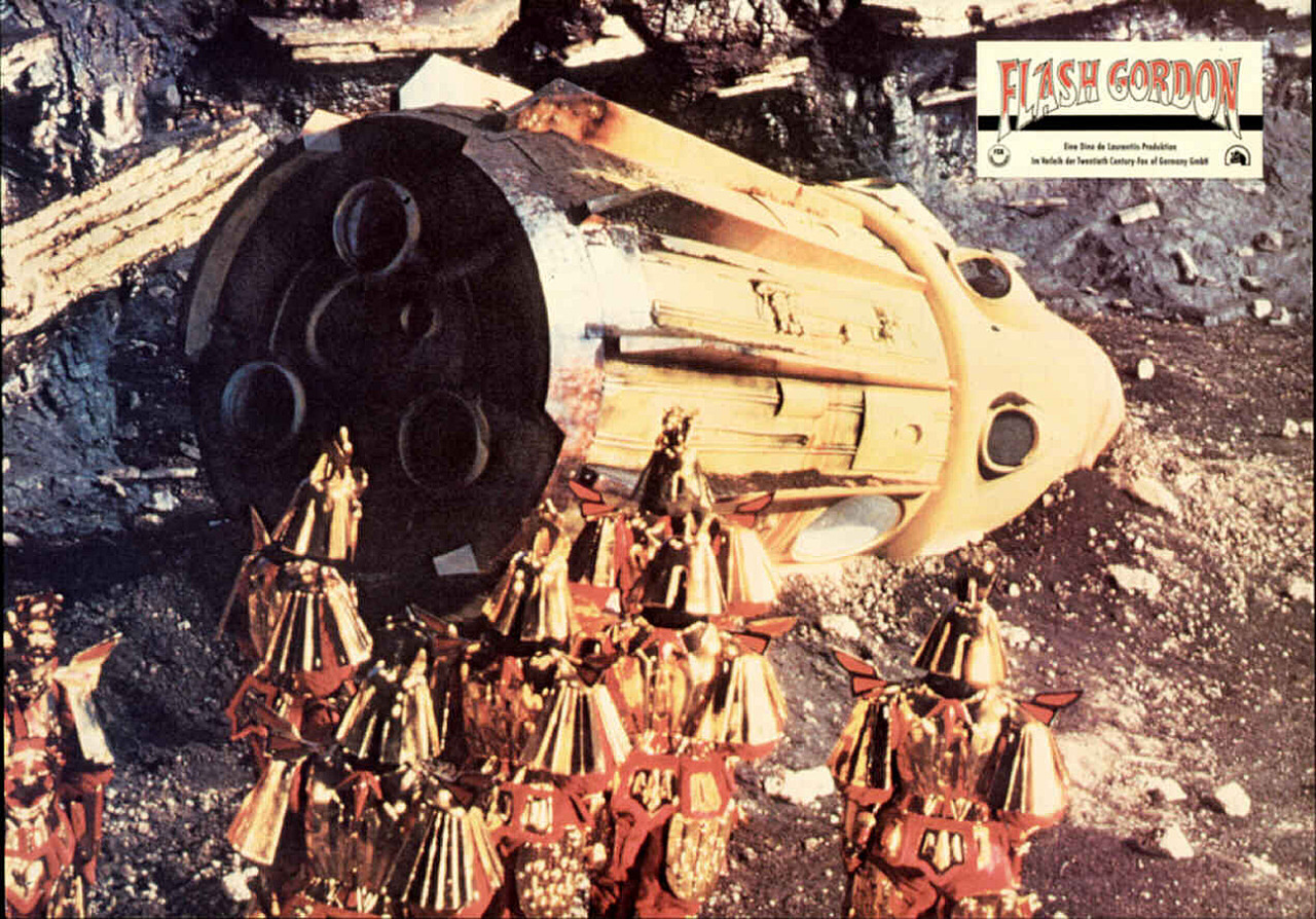 Other than the smell of free popcorn from an old-timey popcorn cart and the deluge of rain that soaked my shoes on the way to the Manhattan theater for that special Saturday matinee in late November of 1980, I distinctly remember seeing two FLASH GORDON elements ahead of the film itself: The epic Philip Castle FLASH GORDON teaser poster featuring the Hawkmen attack on Ming’s War Rocket, and the Universal lobby cards. I have no recollection of watching a trailer…
