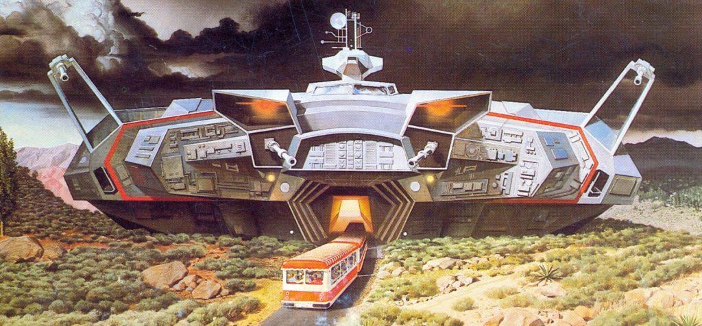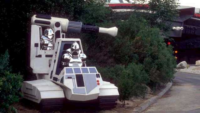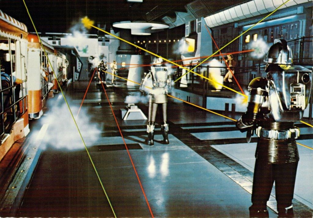 It was finally trip time and we landed in Los Angeles. The excitement was palpable. I couldn’t wait until we could get through the gates of the theme park and board the tram so we could get going with the immersive “Battle of Galactica” experience. We went by the PSYCHO house and Bates Motel. We saw giant props from THE INCREDIBLE SHRINKING WOMAN. Still buzzing from a JAWS attack and the dizzying “Doomed Glacier Expedition” tunnel (not even Steve Austin could defeat that!), we were finally stopped by a Cylon tank, which shot a misty blast from its “laser cannon.” No real lasers?!?