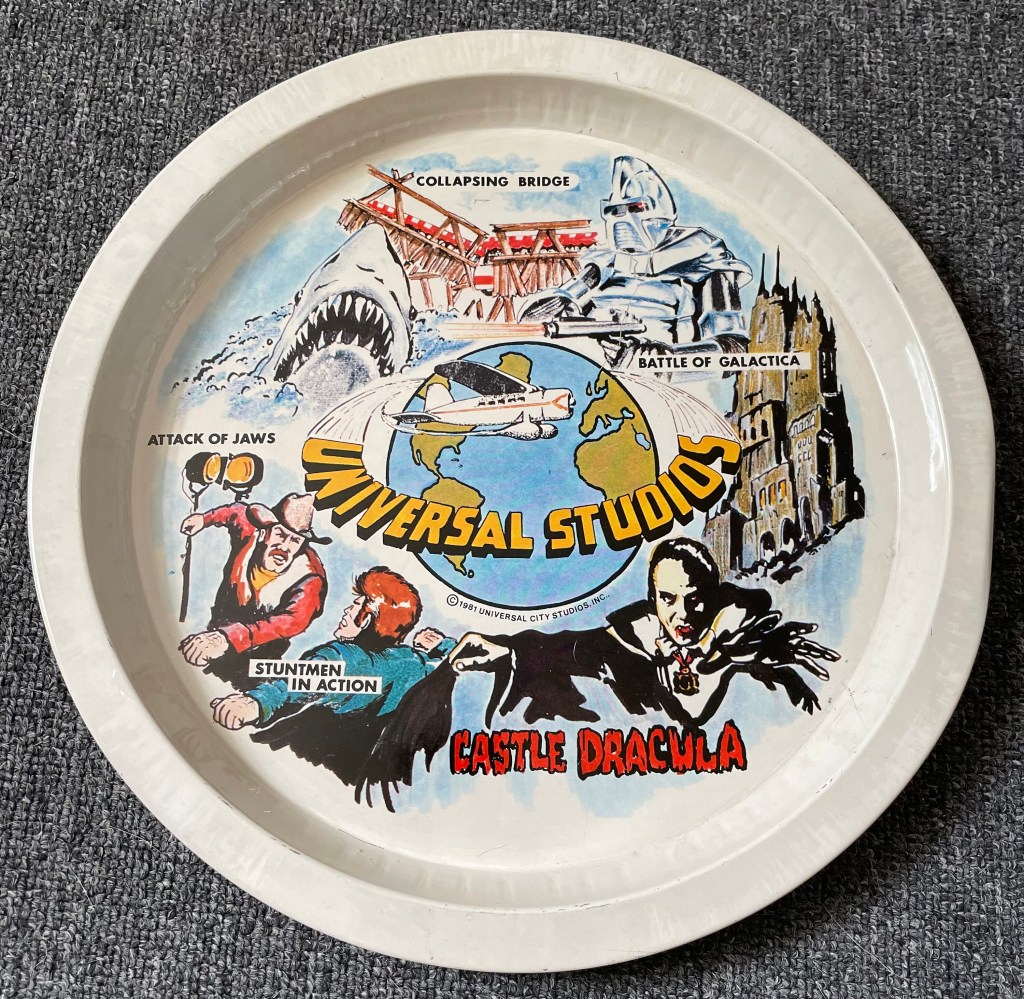 Of course, once the excitement had ended and we finally exited the tram, I was on a high. It was imperative to bug my parents to buy some souvenirs — something like a Universal Studios tin plate, for example — carted away in a colorful “Battle of Galactica” promotional plastic bag. The photo of the plate below is not mine, but I remember similar tchotchkes luring my attention.
