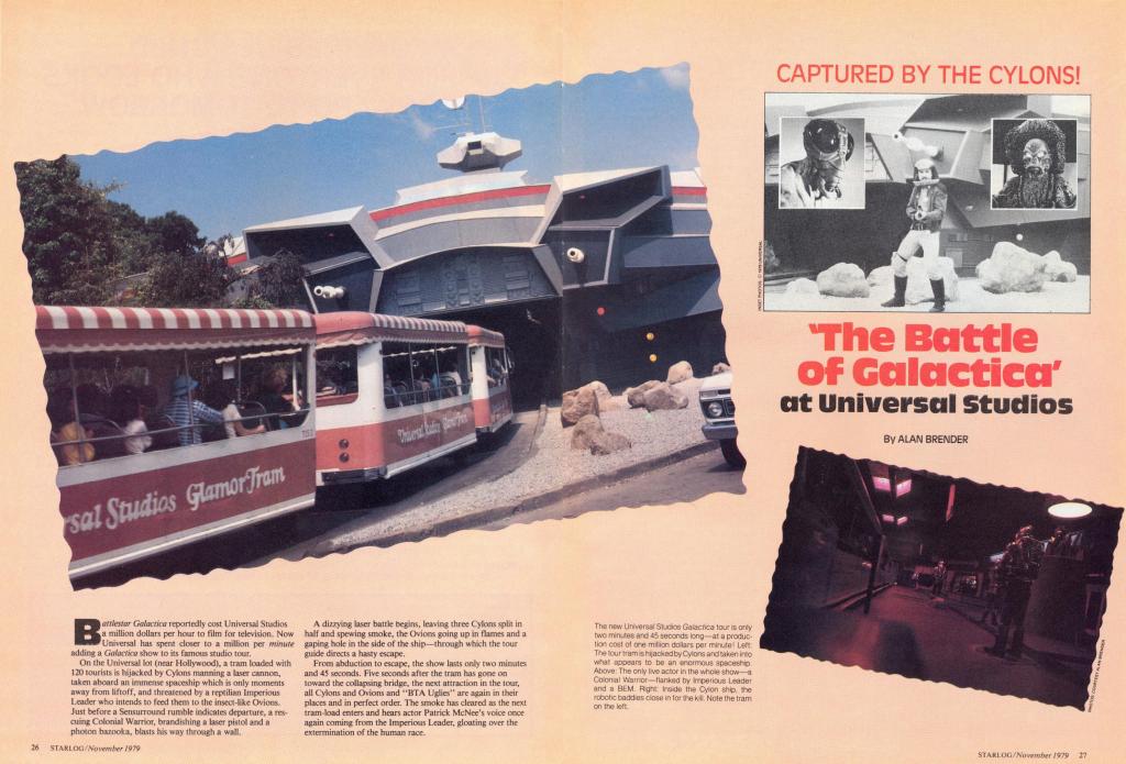The moment-by-moment excitement was finely detailed in that Starlog November 1979 issue: “On the Universal lot (near Hollywood), a tram loaded with 120 tourists is hijacked by Cylons manning a laser cannon, taken aboard an immense spaceship which is only moments away from liftoff, and threatened by a reptilian Imperious Leader who intends to feed them to the insect-like Ovions. Just before a Sensurround rumble indicates departure, a rescuing Colonial Warrior, brandishing a laser pistol and a photon bazooka, blasts his way through a wall. A dizzying laser battle begins, leaving three Cylons split in half and spewing smoke, the Ovions going up in flames and a gaping hole in the side of the ship—through which the tour guide directs a hasty escape.”